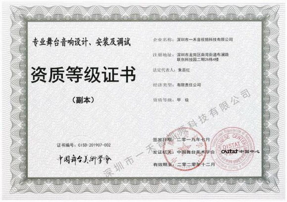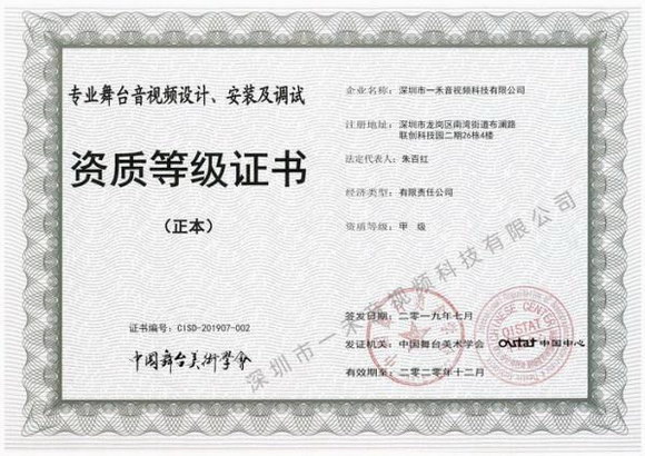 一禾科技更以驕人的成就,一舉取得中國舞臺美術學會四項甲級資質,分別為:專業舞臺機械設計、安裝及調試資質甲級證書;專業舞臺音視頻設計、安裝及調試資質甲級證書;專業舞臺音響設計、安裝及調試資質甲級證書;專業舞臺燈光設計、安裝及調試資質甲級證書。這是繼今年6月一禾科技再次獲得由中國電子學會聲頻工程分會審核頒發的聲頻工程企業綜合技術等級一級資質證書之后的另一個重磅消息。