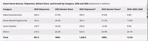 自從比爾蓋茨耗費了7年時間和6300萬美元,把自家別墅打造成世界上智能化最高的豪宅后,智能家居逐漸進入大眾視野。經過多年的發展,智能家居也逐步進入到百姓家中。據IDC發布的數據顯示:2020年全球智能家居設備出貨量超8億臺,預計到2025年將超過14億臺,五年復合年增長率超12%。