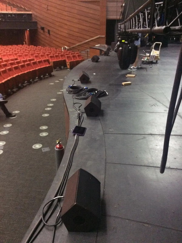 從舞臺臺唇位置到第二圈平臺的最后一個位置,距離足有56米,得益于使用了L-Acoustics專有的模擬軟件Soundvision,精確模擬并顯示出需要添加補聲位置。在后方座位的廊底補聲采用了8XTi點聲源同軸揚聲器。在第一圈平臺與第二圈平臺之間需要提升聲壓級,就選用了水平覆蓋角100度的12寸同軸揚聲器12XTi。最后,7只8XTi揚聲器還在臺唇位置零星布置,以作前區補聲。至于舞臺監聽方面,選用了115XT HiQ,12XT和8XT揚聲器,在有話筒的位置作為監聽,還選用了SB18作為鼓的低頻監聽。