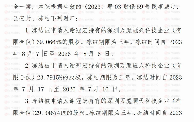 HKmoreHoldingsLimited、深圳萬魔人聚科技企業(yè)(有限合伙)、深圳萬魔冠興科技企業(yè)(有限合伙)等公司成為被執(zhí)行的對(duì)象,一同遭遇股權(quán)凍結(jié)的對(duì)象還涉及到三位萬魔前合伙人于世璿、林柏青、章調(diào)占。