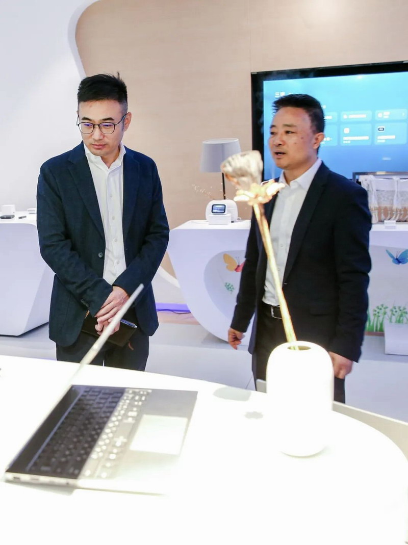 ▲參觀三諾算力類信息終端。三諾已構建起“云+端”“軟+硬”泛信創的整體解決方案,是為數不多能覆蓋云電腦、信創電腦,PC、服務器等全品類計算機產品研發制造的中國本土企業,為全球頭部品牌企業提供全程服務,累計出貨2000多萬臺