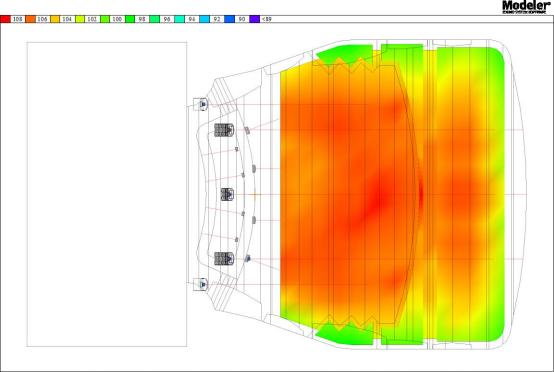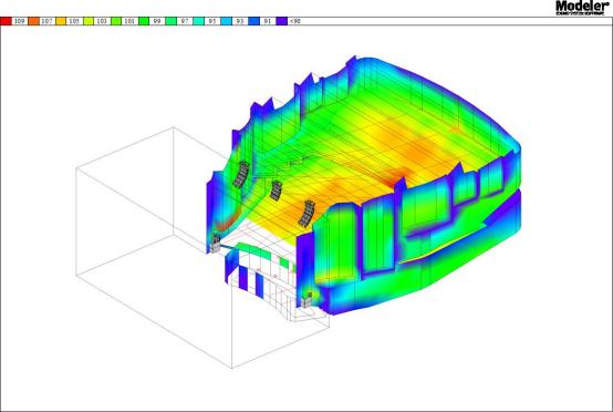 因此,Bose Professional通過Bose的聲場模擬分析軟件Modeler5),對揚聲器的安裝位置及角度進行多次聲場模擬分析,最終采用非對稱水平角度的弧形曲率陣列揚聲器來實現(xiàn)最佳的音色平衡,減少側墻反射(從圖2可以看出,打在側墻的聲能量幾乎沒有),對不同位置的聽音區(qū)提供均勻的聲覆蓋(從圖3可以看出,整個觀眾區(qū)的聲場覆蓋非常均勻)。