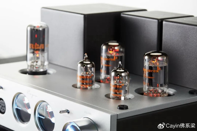 HA-2A與其他HA系列不同的地方在于,她是Cayin首款全部采用古董管NOS(NEW OLD STOCK即全新未使用過的庫存古董管)設計的電子管耳放。整機一共五支電子管,其中RCA 17AX4GT作為膽整流,負責前級電子管的屏極供電,充分發揮電子管整流獨有的諧波豐富和溫暖細膩的音色聽感。而前級和功率管均采用著名的“吹喇叭”電子管,前級管和功率管分別是兩支Amperex ECF82/6U8 和Amperex 17BF11,并經過嚴格檢測配對組成。