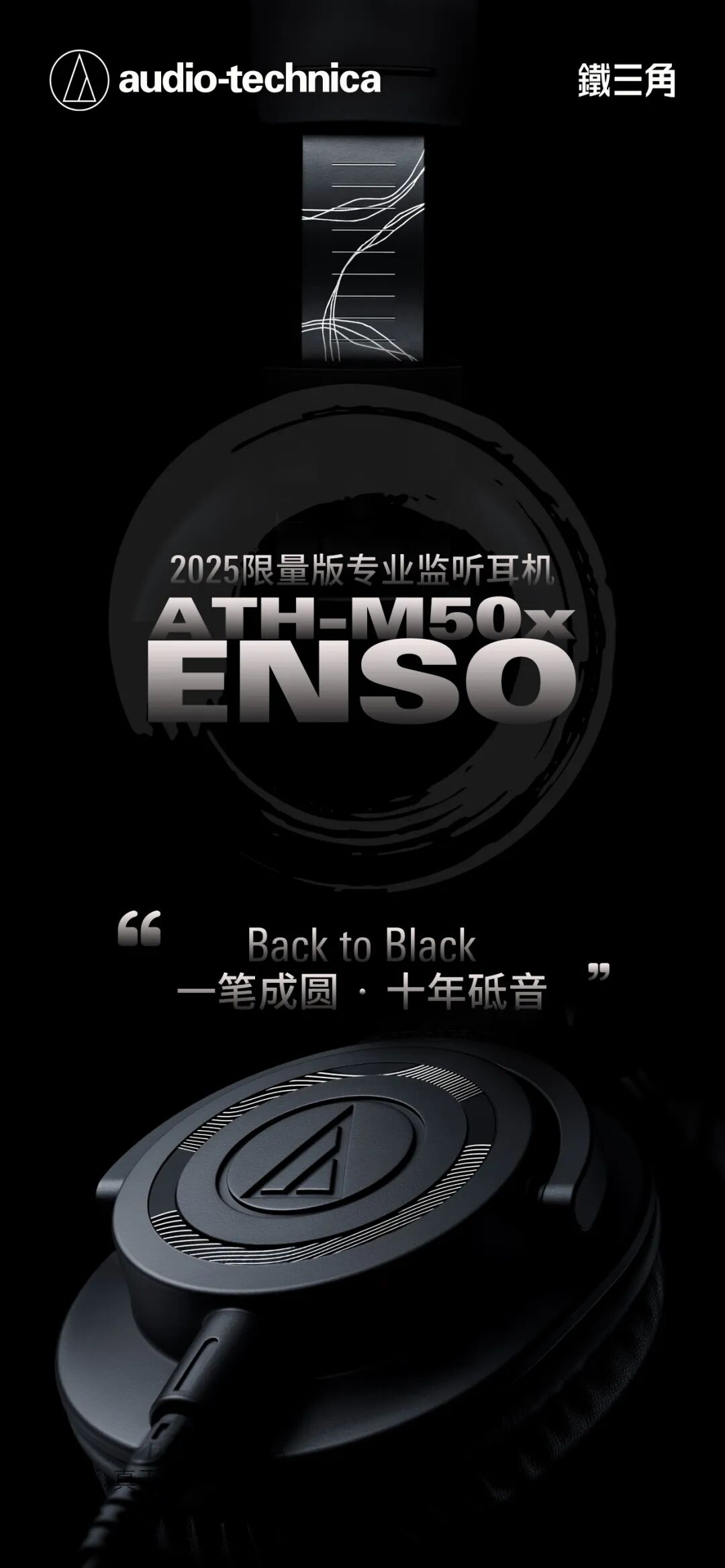 自2014年問世以來,ATH-M50x憑借卓越音質,深受全球音樂創作者與愛好者的青睞。鐵三角不斷推出限定款式,以多元設計詮釋聲音美學。值此M50x問世十周年之際,鐵三角推出2025限量版ATH-M50x ENSO,重返全黑經典設計,既是對初代版本的致敬,亦是對專業監聽美學的深度重構。